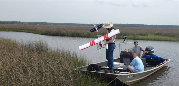Northern Gulf Institute, Robert Moorhead has been launching unmanned aircraft from a small boat, so his team of researchers can map marshes without dragging heavy equipment over the fragile landscapes.